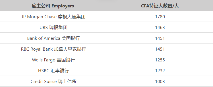 雇佣CFA协会会员的七大顶级雇主及公司CFA持证人人数:
