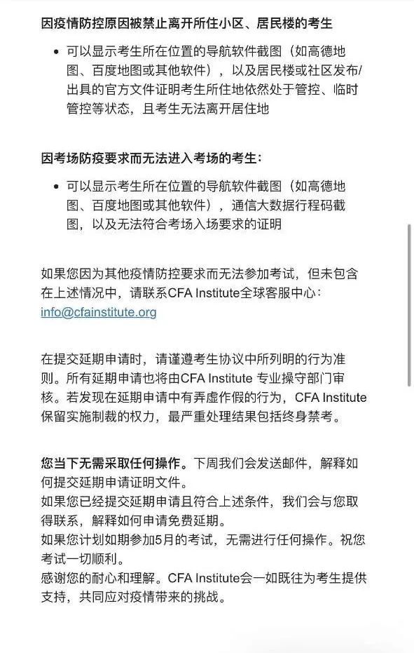 以上就是这次可以申请免费延期的情况,如果你是其他疫情防控要求而无法参加考试,但是不是上述情况,请联系CFA协会全球客服:info@cfainstitute.org