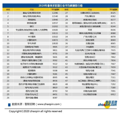 从2020年春季求职期行业平均薪酬排行榜可以看出