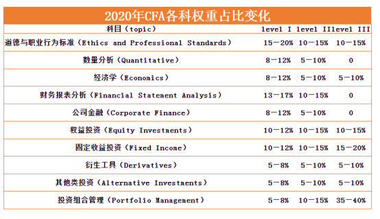 【解读】在科目变化上CFA一级是变化很大的,CFA一级的各科权重都是一个固定值,但是现在一级也和二三级一样了,各科权重占比也变成了区间,对于各科的题目数量带来不确定性。